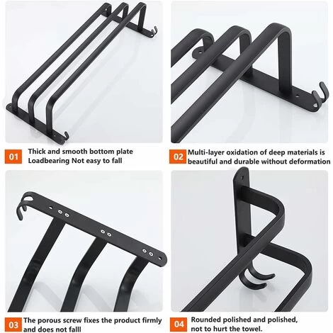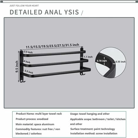 Towel rack three layers: the design of three upper and lower rods can hang multiple layers of towels and bathroom products. dry, which can effectively reduce the growth of bacteria.[High quality material] The surface is made of high quality aluminum alloy, which is lightweight and strong in corrosion. After anodizing treatment, it can effectively prevent corrosion and rust, avoid daily scratches, and ensure long service life. and long service life.[Enough] The thickened fixing bar makes the towel bar more stable and can fix heavy bath towels. It is very suitable for families and modern hotels to hang and organize your towels, bath towels and clothes.[Easy Installation] The hole installation method can be easily installed on the wall. All accessories included, suitable for most walls. Suitable for bathroom, kitchen, living room, etc. The unique design is very easy to clean. clean.[Widely Use] This towel rack is an ideal choice for hanging towels and clothes in the bathroom. For the kitchen you can hang kitchen utensils and tea towels. They can also be used by hairdressers. They can be attached to the wall, saving a lot of space.