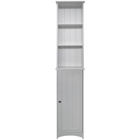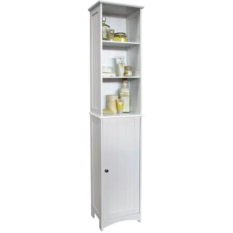 With a footprint of only 34 x 23cm, it is surprising how much storage this tall tidy provides. There are three open display / storage shelves (two adjustable) and a cupboard with chromed metal door handle and an additional two internal adjustable shelves ideal for holding loo rolls and toiletries. Shelf opening: 20d x 27w x 79h / Cupboard opening: 19d x 27w x 75.5h cm. Door can only open on side shown and cannot be changed to the other side. Display items not included. PRODUCT IMPROVED FOR 2018.SIZE: 165h x 34w x 23d cmMATERIALS: MDF – Painted / MetalCOLOUR/FINISH: WhiteEasy Self Assembly – build time: 30 mins approx