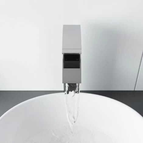 The Osmo high rise basin mixer has an attractive curved spout with matching square lever for controlling flow and temperature. Ideally they should be fitted with a countertop basin.