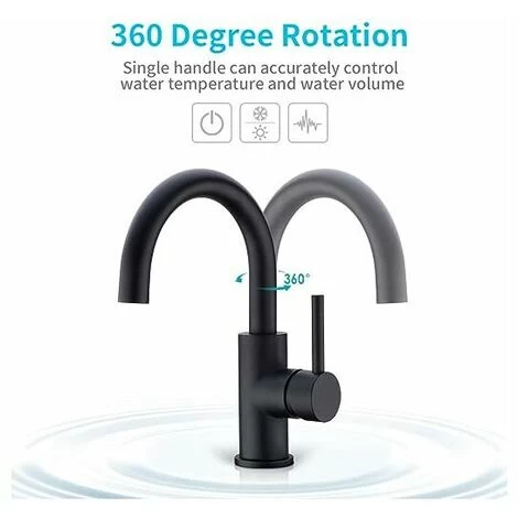 EASY TO USE: Black faucet can easily be rotated 360°. Perfect for two sinks. This black mixer is suitable for small kitchens and bathrooms. HIGH QUALITY: Black kitchen faucet is made of 304 stainless steel. The black coating also prevents corrosion and makes cleaning easier. No water spots or fingerprints. WATER SAVING: Thanks to the Swiss Neoperl honeycomb aerator, the black bathroom mixer tap saves more than 30% water. The ABS aerator is removable and easy to replace. EASY TO INSTALL: The standard 3/8 flexible connection hoses . They ensure the safety of drinking water. The connection hoses are already installed on the black kitchen sink taps.