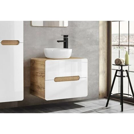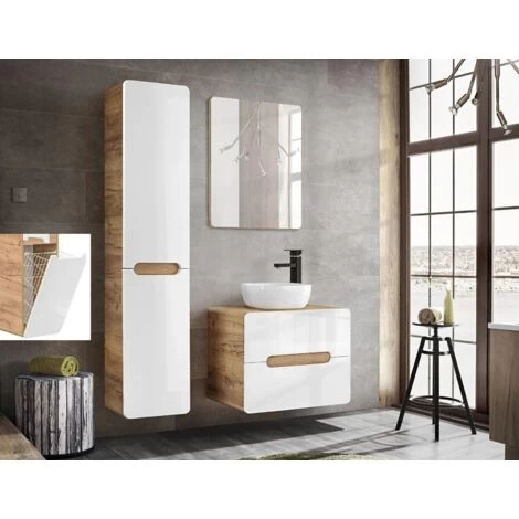 Bathroom Furniture Set with Tall Laundry Unit & 600 Vanity Countertop Sink White Gloss Oak Arub