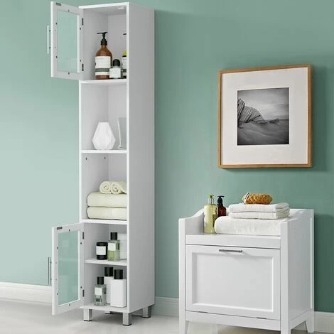Featuring 2 open shelves and 2 enclosed cabinets with tempered glass doors, this freestanding bathroom cabinet provides ample storage space while taking up little floor space. Besides, you can change the positions of the shelf in the lower cabinet to place items at different heights. This bathroom tower cabinet can also be used as a storage cabinet in the living room, kitchen, study room or laundry to store books, photo frames, wines, glassware, stain cleaners, etc. Made of premium MDF and engineered wood, this bathroom organizer can serve you for a long time. The 4 raised legs made of rustproof & solid aluminum keep the cabinet from water immersion and allow you to clean the floor easily. Moreover, the anti-toppling device at the back of the cabinet offers added security.