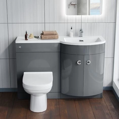 A combination of basin, toilet and WC unit which features a white resin basin top, a modern grey cabinet with two doors and contemporary chrome finished handles which will bring a stylish look to your bathroom.
