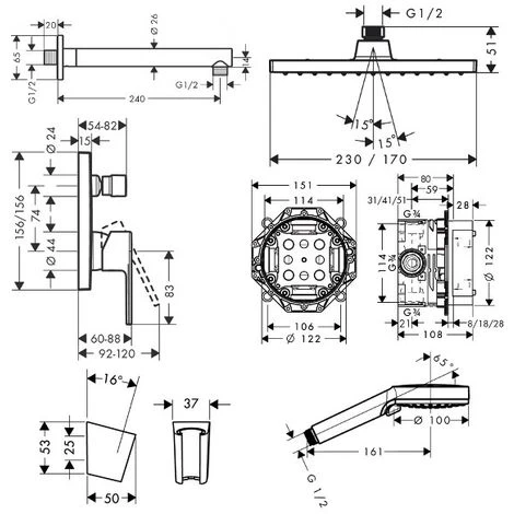 - Shower head size: 230 x 170 mm