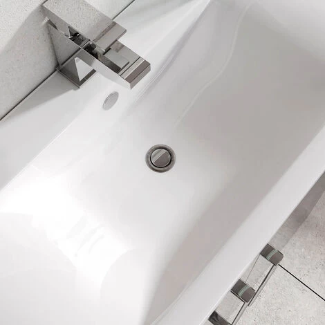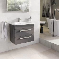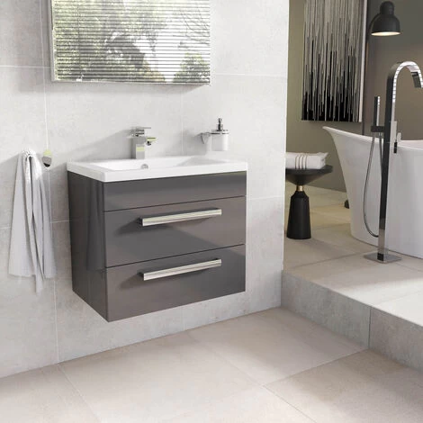 The vanity unit is crafted from manufactured wood with shiny gloss finish. The unit has two drawers providing storage for your bathroom essentials which have a soft close mechanism to prevent slamming and are complete with chrome bar handles. The unit also comes with a ceramic sink that has 1 pre drilled tap hole. The benefit of a wall hung vanity unit is that is gives the illusions of more space in your bathroom as you can see the open floor space underneath.