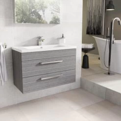 The vanity unit is crafted from manufactured wood with a melamine wood effect wrap finish. The unit has two drawers providing storage for your bathroom essentials which have a soft close mechanism to prevent slamming and are complete with chrome bar handles. The unit also comes with a ceramic sink that has 1 pre drilled tap hole. The benefit of a wall hung vanity unit is that is gives the illusions of more space in your bathroom as you can see the open floor space underneath.