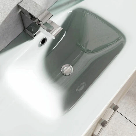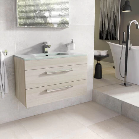 The vanity unit is crafted from manufactured wood with a melamine wood effect wrap finish. The unit has two drawers providing storage for your bathroom essentials which have a soft close mechanism to prevent slamming and are complete with chrome bar handles. The unit also comes with a glass sink that has 1 pre drilled tap hole. The benefit of a wall hung vanity unit is that is gives the illusions of more space in your bathroom as you can see the open floor space underneath.