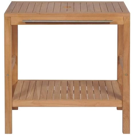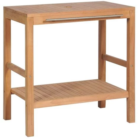 This bathroom cabinet looks beautiful in its plain and simple style, which will perfectly match your bathroom decor. It has a hole on the sturdy top surface, which is designed for your bathroom sink drainage. The sink cabinet is constructed from solid teak which is durable enough for you to place a basin on the top and other bathroom accessories. The bathroom furniture has a handrail for the use of hanging towels or clothes. It also stands with four supporting legs to ensure stability and dryness above the ground. The cabinet will suit perfectly under your sink and make bathroom storage quite convenient. The product is applied with a beautiful finish to give the wood a warm colour. This cabinet needs assembly.
