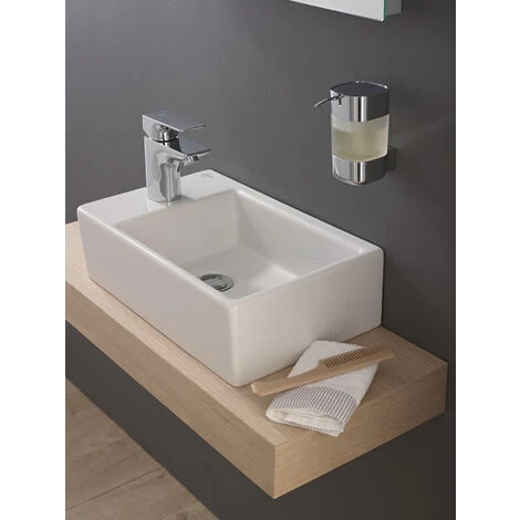 - Rectangular washbasin with a flat rear panel with a tap hole on the left.