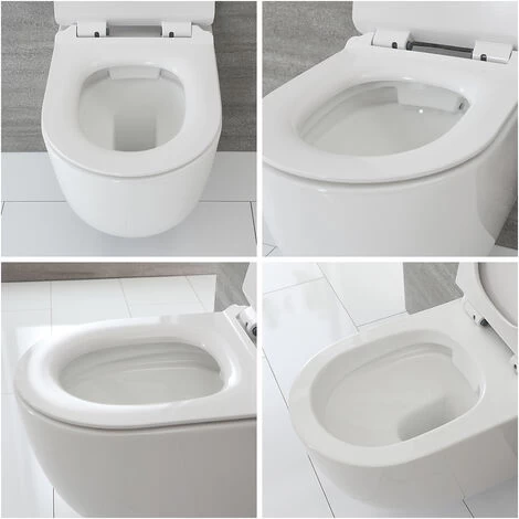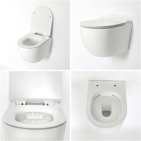 – Premium quality ceramic wall hung rimless toilet with hard-wearing white glazed enamel and soft close seat