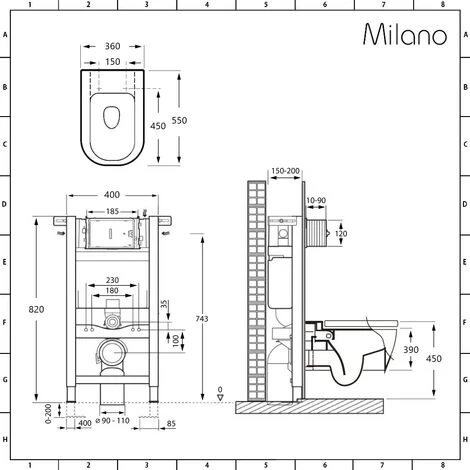 – Dimensions (WxDxH): 360mm x 550mm x 390mm (toilet); 400mm x 150-200mm x 820mm (wall frame)