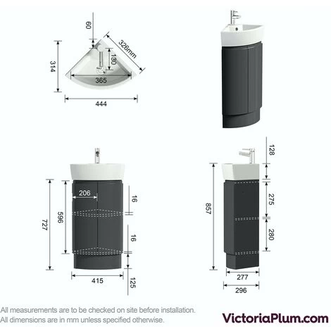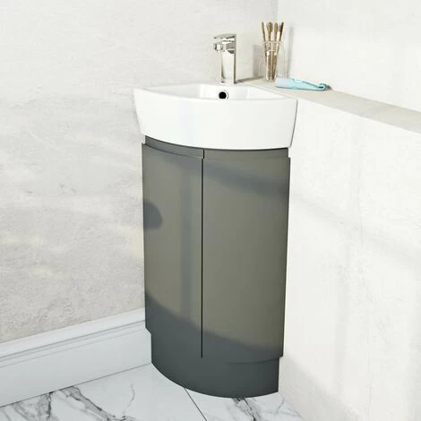For sumptuous style in your ensuite or cloakroom, this stunning corner vanity unit with basin from our Harrison slate range is absolutely ideal. Designed specifically to optimise the space in a compact bathroom, this corner unit comes complete with a highly attractive high gloss grey finish. Featuring a 2 door storage area, with ample room for all your bathroom essentials, it also comes with a high quality ceramic basin, with integral overflow and a single tap hole, ready for your choice of basin mixer tap.Why not mix and match with other items from the Harrison slate range for a consistent style.
