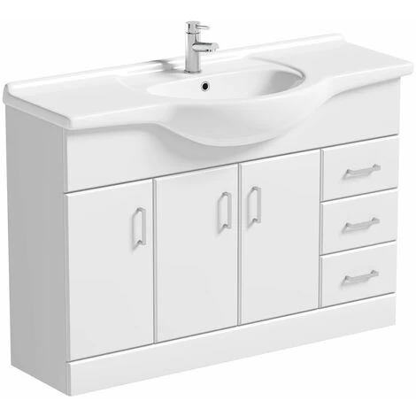 Maximise the space in your master bathroom, with this highly stylish vanity unit from our Eden white, featuring a sparkling high gloss finish that is easy to maintain. At 1200mm in width, this is the largest version of this vanity unit that we stock, making it perfect for master bathrooms, where a large basin and plenty of storage space is required. Smaller sizes are available. The unit comes with one large cupboard with shelf, a smaller cupboard and 3 drawers with metal runners, perfect for smaller items. Supplied fully assembled, meaning no difficult construction, this vanity unit contains a high quality ceramic basin, soft close doors and contemporary chrome handles. For a consistent look in your bathroom, why not add a back to wall toilet unit and mirror from the same range?