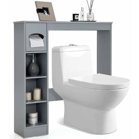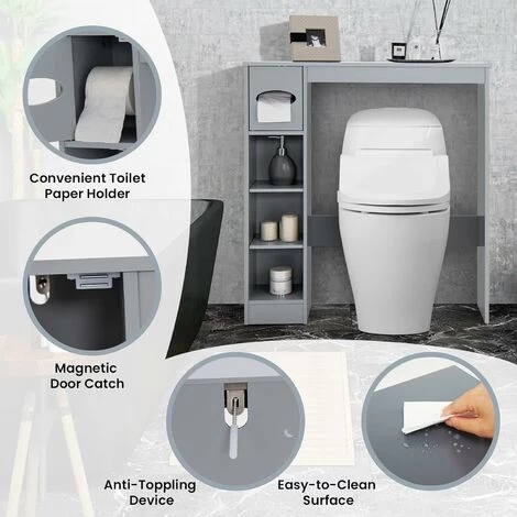 Featuring a unique over-the-toilet design, this bathroom storage cabinet utilizes the wasted storage area around the toilet to offer convenient and smart storage for your bathroom essentials. 3-tier open storage shelves and a toilet paper holder are designed to hold and organize soaps, shampoos, towels, toilet paper, small decorations and more. Besides, the 2 open shelves are adjustable, allowing you to store items with different heights. Made of premium MDF, this bathroom storage organizer ensures long-lasting use. The back anti-toppling device and bottom reinforced crossbar provide added stability and security. Moreover, this modern and multifunctional storage cabinet fits well with any home decors and can be used in the bathroom, laundry, etc.