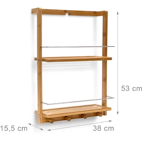 2 large storage shelves provide enough space for shower accessories, cosmetics, or even spices, oil bottles, etc. High metal rails secure larger bottles and tubes. The four hooks on the bottom can support cloths, hand towels, brushes or other similar items.