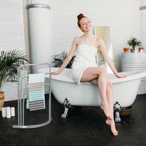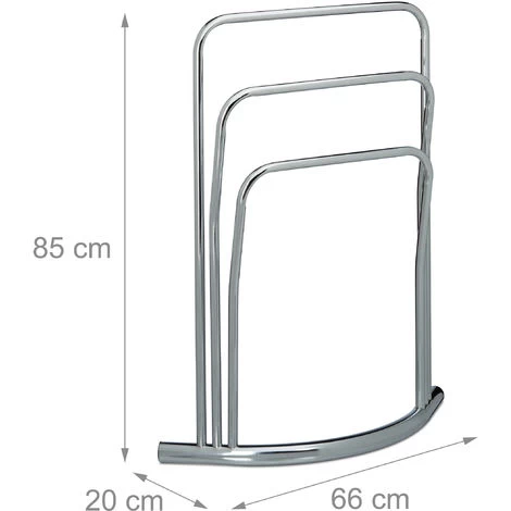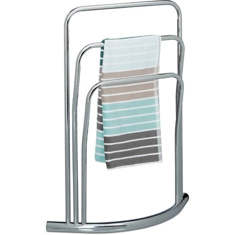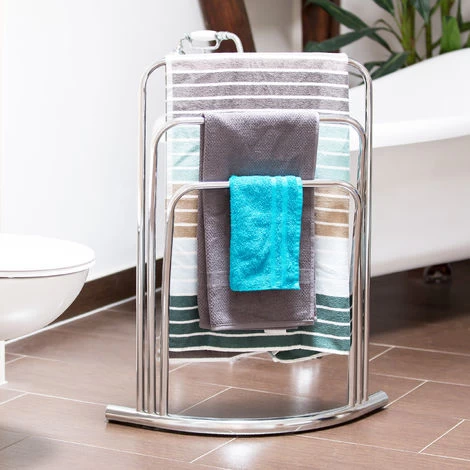 The 3 towel rails provide ample space for hanging up hand towels or small bath towels. The staggered bars allow air to better circulate, causing towels to dry faster and prevent them from developing strange odours. The rack can also be used as a valet stand in the bathroom or as a clothes butler in the bedroom. The elegant looking stand looks fantastic in any modern environment.