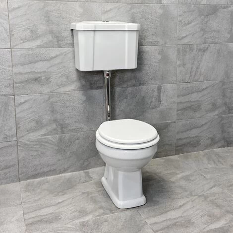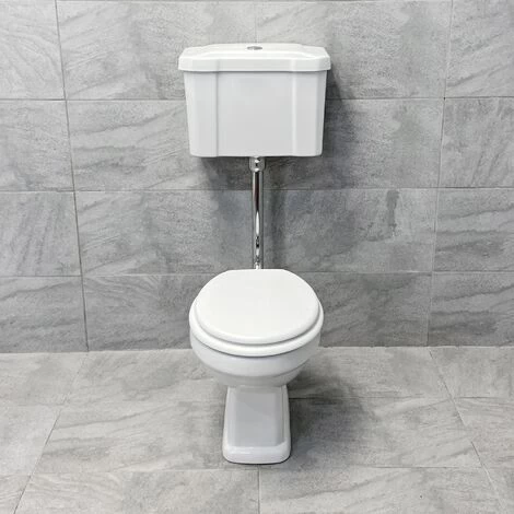 Traditional Victorian style Savoy low level toilet, including a heavy duty seat, chrome pipework and a chrome push button flush