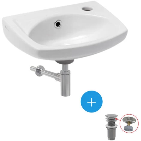 Let yourself be tempted by the wall-hung basin set with tap hole, overflow, 35x28cm + pop-up waste + washbasin siphon (EUR913-SET2).