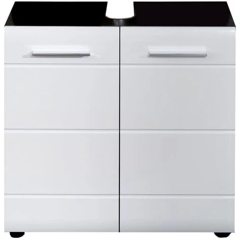 - Practical bath vanity unit: This bathroom cabinet has two doors with glossy chrome plastic handles.
