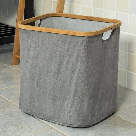 Made of bamboo with varnished coating. Laundry basket is made of polyester linen-like fabric.