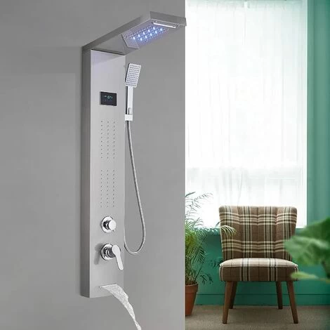 This 5-function LED display shower tower panel from ROZIN has 2 buttons. The upper button controls the switching of the water outlet mode, and the lower button can control the water temperature switch.