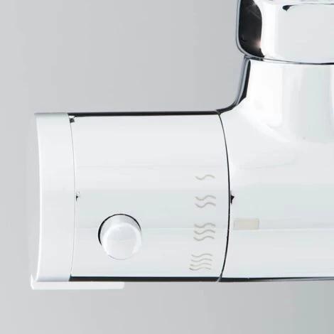 The bathroom mixer tap is distinguished by a replaceable thermostat element and temperature scale with child-protection at 38 °C. Its unique Eco-Stop-Function contributes to up to 50% less water consumption.
